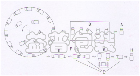 Empty bottle automatic placed in hopper B-àbottle lifting to a rotary table to gain rotating speed at Cà empty bottle at D&F in vertical positionàbottle outfeed at H.